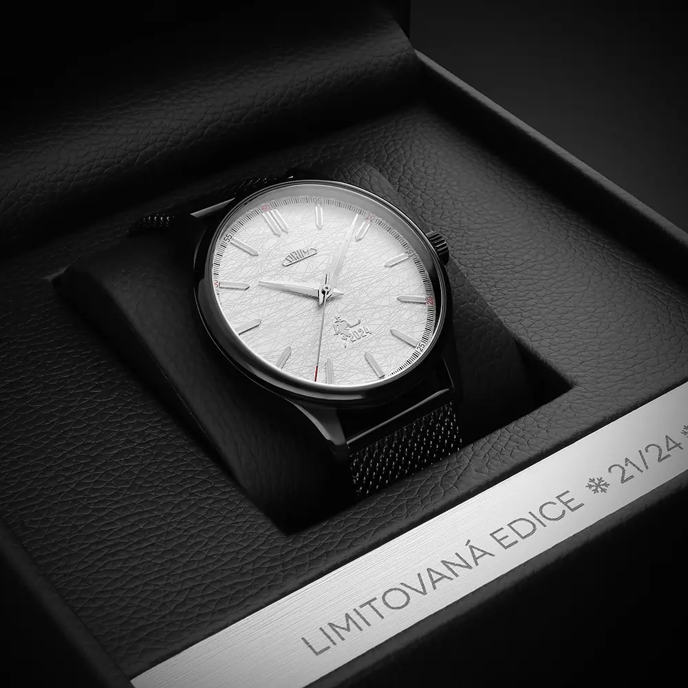 Na výběr máte ze dvou barevných variant – elegantní černé a symbolické zlaté. Jakou barevnou variantu zvolíte je pouze na vás, celkově je vyrobeno 24 kusů! Hodinky jsou dodávány s ocelovým mesh tahem. V případě zájmu o kožený řemínek lze dokoupit RB.13206. 22 mm
